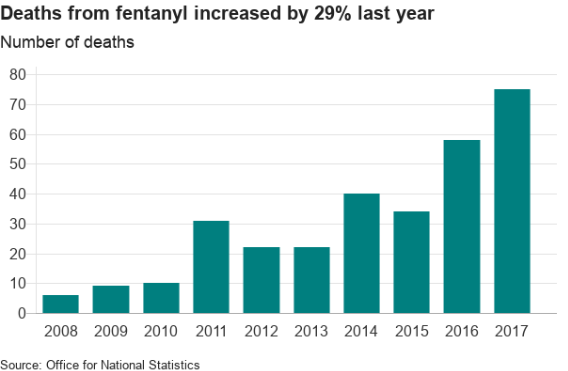 虽然芬太尼最初只在白人农村人口中流行,但现在死亡人数正变得越来越普遍。芬太尼进入更多的海洛因市场,这也可以解释最近美国城市中年龄较大的黑人过量吸食海洛因死亡人数变多的原因。摄入过量芬太尼死亡的人数大幅上升,而与此同时,单纯摄入海洛因、处方阿片类药物和美沙酮导致的死亡数相应下降了很多。