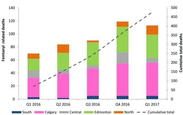 根据CBC的报道,艾伯塔省卫生部门在2016年发布的数据,仅在当年前3个月,该省就有70例因过量摄入芬太尼的死亡病例,该省全年一共有363人死于芬太尼过量。而在2017的前3个月,该省因过量服用芬太尼死亡的人多达113人。