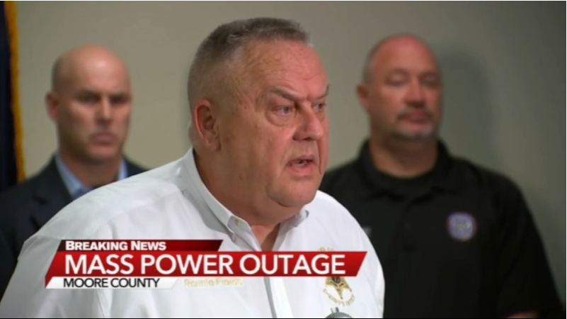 菲尔兹在星期天的新闻发布会上说,星期六晚上7点刚过,停电就开始了,然后蔓延到摩尔县的中部和南部。