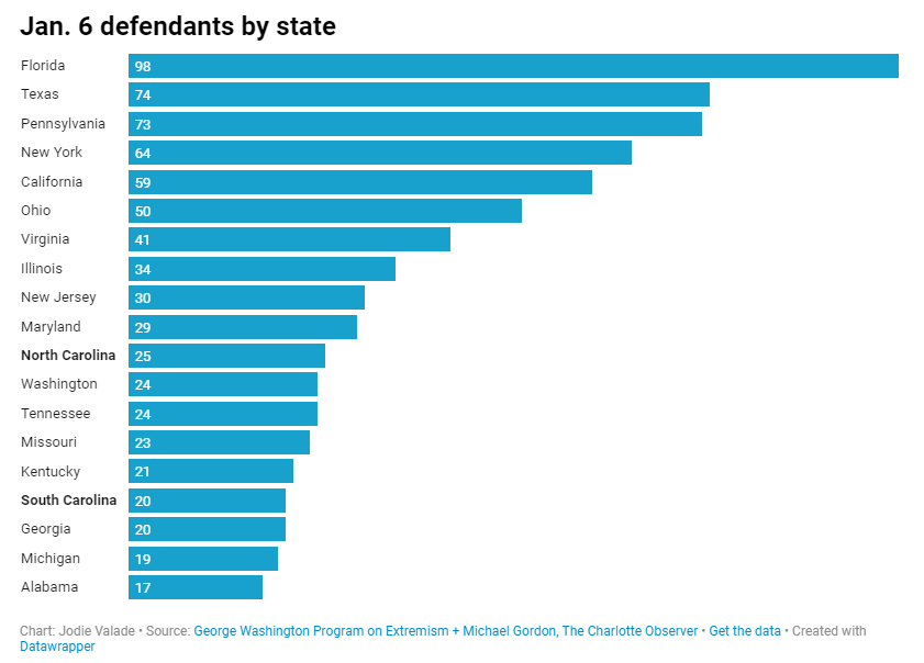两年后,针对北卡罗来纳州和南卡罗来纳州人的联邦刑事案件继续增加。 在过去的一年里,被控犯有与国会暴力相关的联邦罪行的北卡罗来纳州居民人数从 14 人猛增至 25 人。至少有 20 名南卡人被控。 另有 9 名北卡罗来纳州居民因与 1 月 6 日相关的较轻指控而被捕。这些指控由华盛顿特区高等法院处理。大多数案件已被撤销。