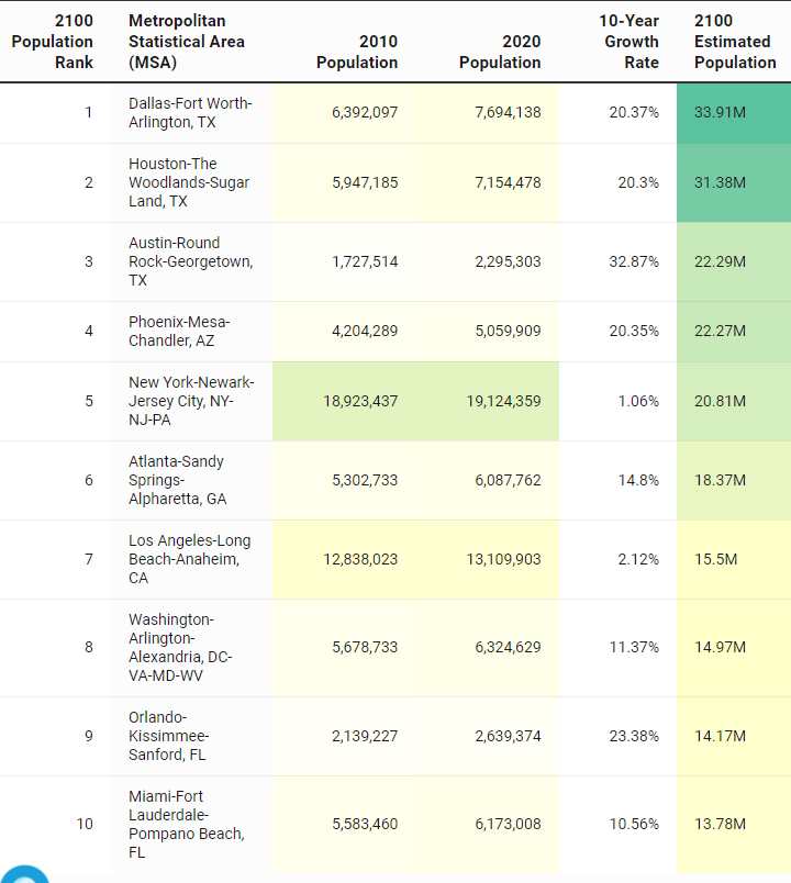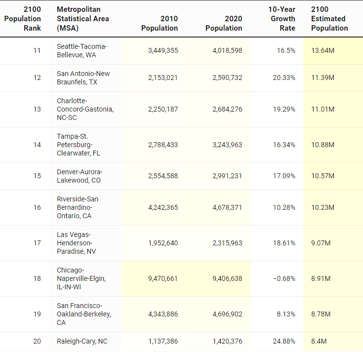 根据美国人口普查局的数据,该榜单是根据2010-2020年人口普查对美国所有人口超过25万的大都市地区的人口增长率编制的,以预测2100年美国最重要的大都市地区。