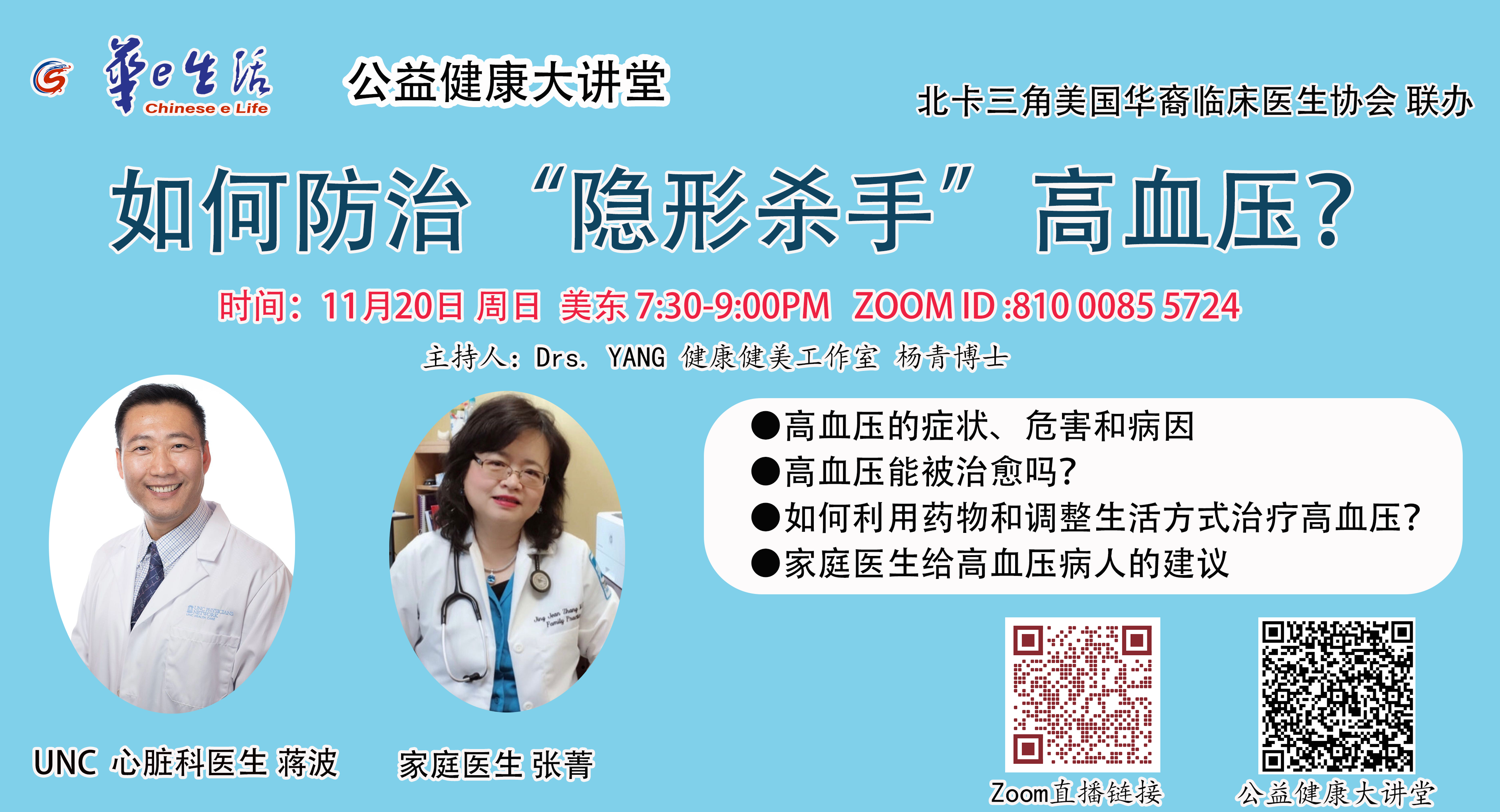【华e健康大讲堂】如何防治“隐形杀手”高血压?UNC心脏科医生蒋波、家庭医生张菁20日(周日)联袂分享