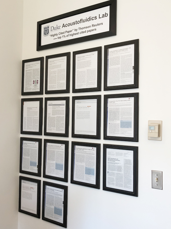 为什么将其形象地称为“镊子”?黄教授打比方说,一位身手不凡的足球好手,可以用一记精准的弧圈球,将皮球从禁区外射进守门员扑不到的死角。他的团队擅长用声波操纵流体和流体中的生物颗粒,可以让癌细胞从其他细胞中分离出来,也可以让某一个细胞在液体中“写字”,留下诸如“DUKE”之类人为设定的“足迹”。这种驾驭声波的能力是他的团队长期探索和积累修炼出来的,也为他们赢得了世界性的影响和声誉。