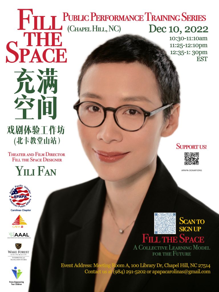 2022年12月10日,范伊立女士将把“充满空间”戏剧体验工作坊带到北卡,在教堂山公共图书馆举办3场公益体验活动。中英文双语教学,无需任何专业基础,儿童、青少年、成人均可参加。