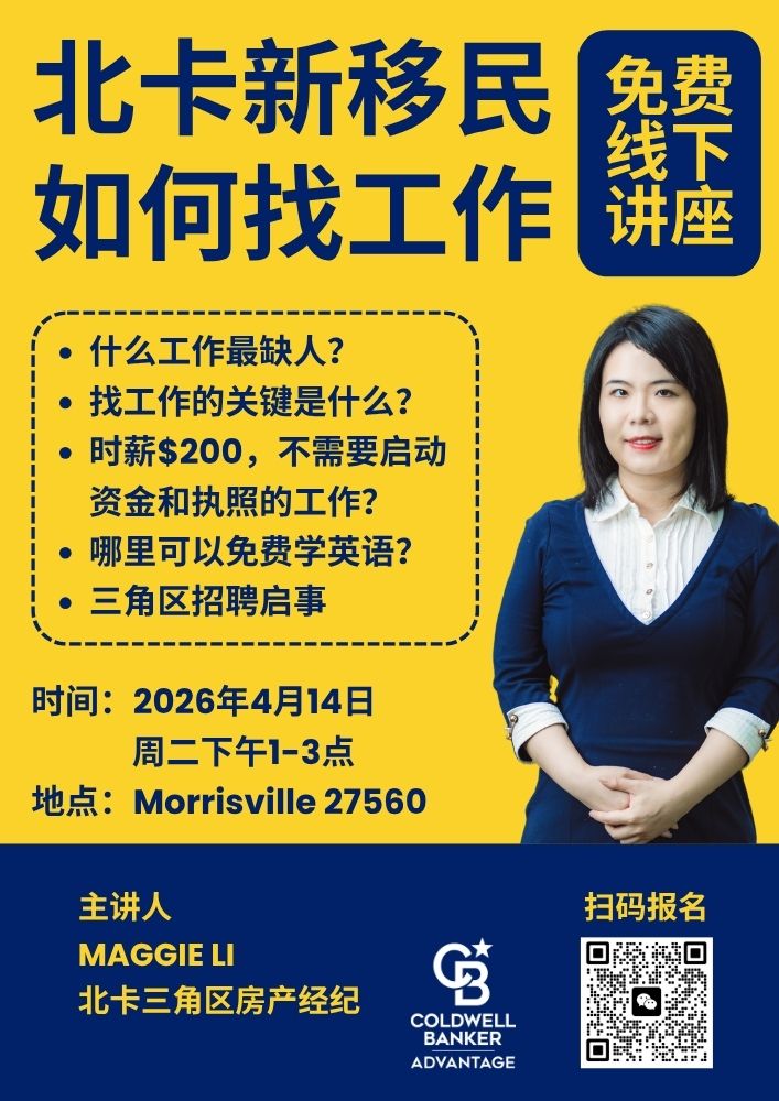 COLDWELL BANKER 公司房产经纪人 MAGGIE LI将带来免费线下讲座,帮助新移民更好融入职场,掌握找工作的技巧。