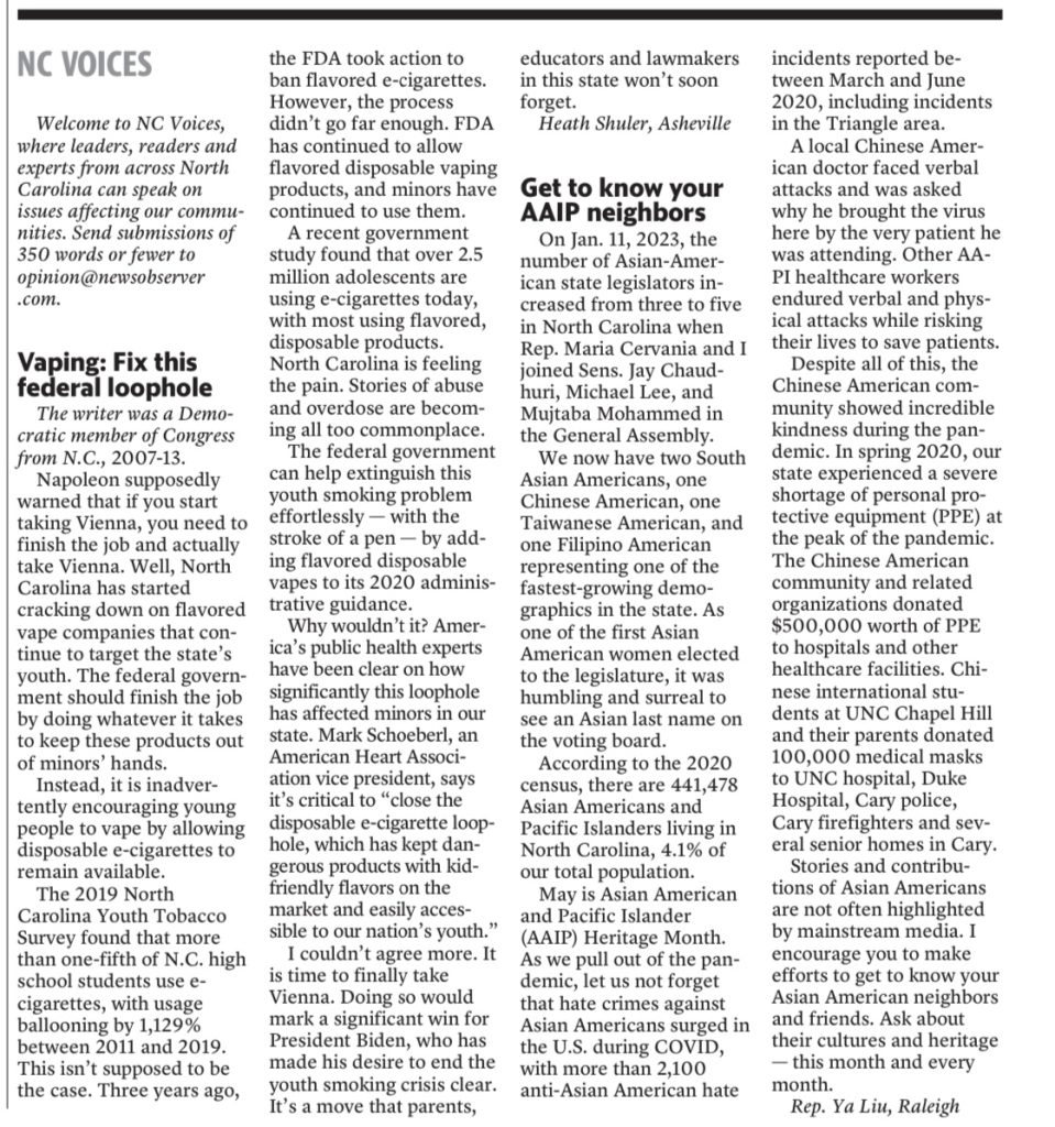5月是美国亚太裔遗产月。北卡三角区最大的报纸《新闻与观察家》(News & Observer)近日在“北卡声音”(NC VOICE)栏目刊发首位华人州议员刘广亚的文章《请去认识您的亚太裔邻居》(Get to know your AAlP neighbors),呼吁主流族群走进亚太裔邻居,更多了解这个未被主流社会重视的群体。
