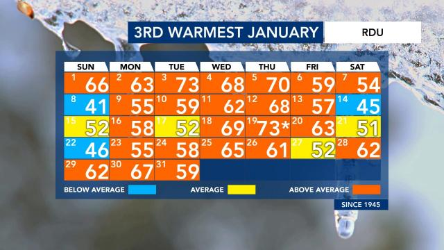 这并不令人惊讶,因为今年1月是1945年以来第三热的1月。罗利的平均气温为华氏49.5度,比平时高出7.6度。