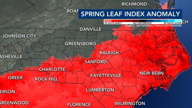 国家物候网的春季叶片指数异常显示,春季叶片将比正常情况提前几天出现。一篇文章指出夏洛特将提前11天看到春天的叶子,罗利很可能也会这样。