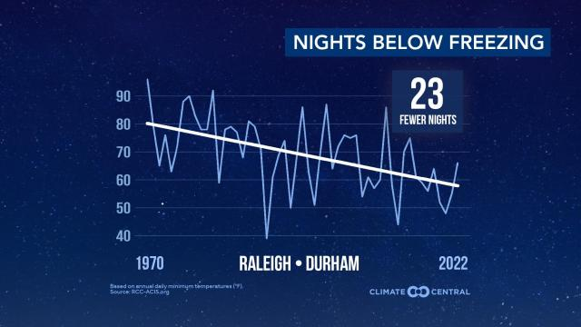 根据全年日最低气温,低于冰点的夜晚较少。在罗利和达勒姆,从1970年到2022年,这一数字平均减少了23个晚上。