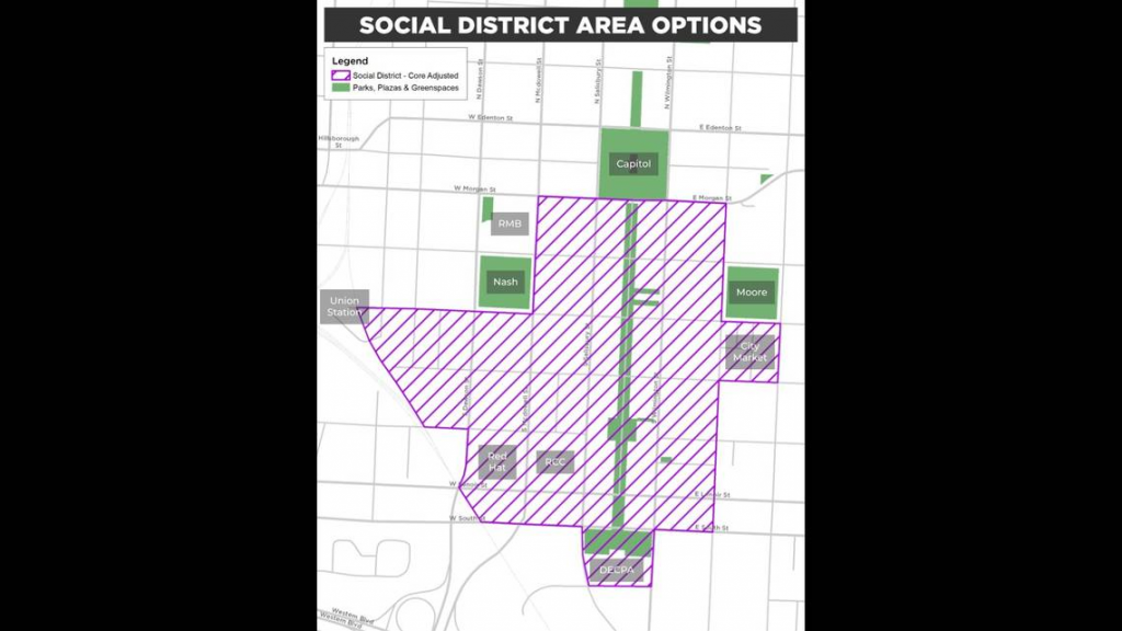 市议会在一个委员会上详细讨论了社交饮酒区的范围,这一区域位于费耶特维尔街(Fayetteville Street)和摩尔广场( Moore squares)以及纳什广场(Nash squares)之间的辅助街道,其中包括罗利会议中心(Raleigh Convention Center)、红帽圆形剧场(Red Hat Amphitheater )和杜克能源艺术表演中心(Duke Energy Center for the Performing Arts)。