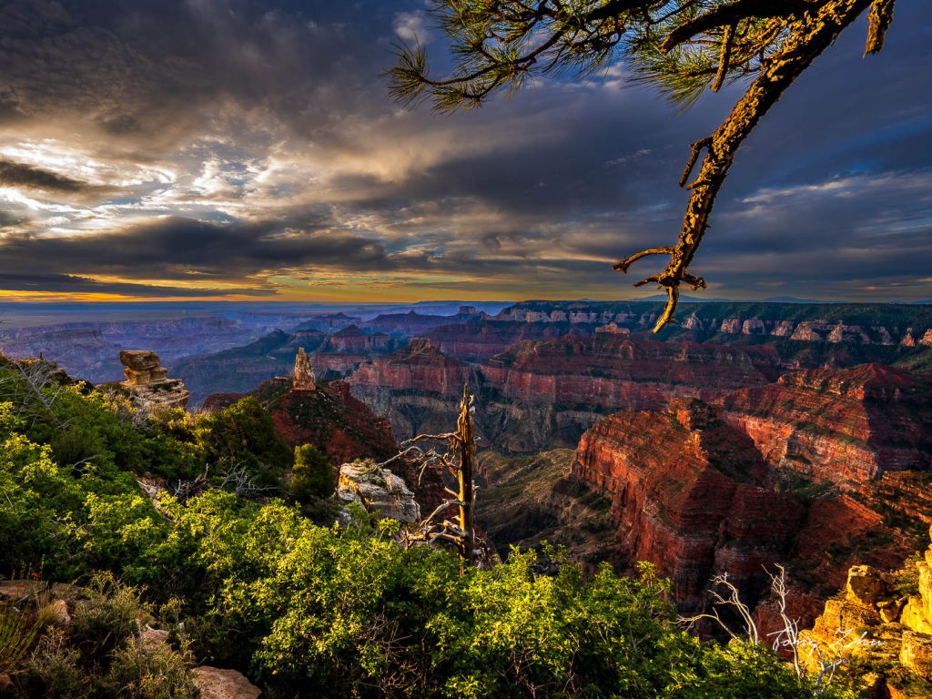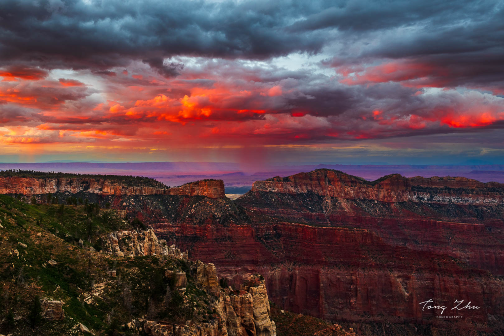 Description: 2023年8月摄于Grand Canyon National Park。残阳将乌云烟雨抹上最后一笔血红。