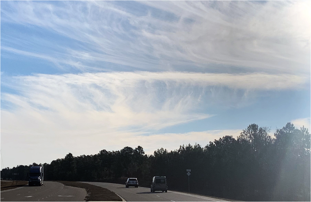 Description: 疑似瀑布天上来 拍摄地点: Pinehurst, NC 2023年1月 上班路上, 看前方, 情不自禁地停下车, 拍下这张照片。 请看下一张照片做比较。
