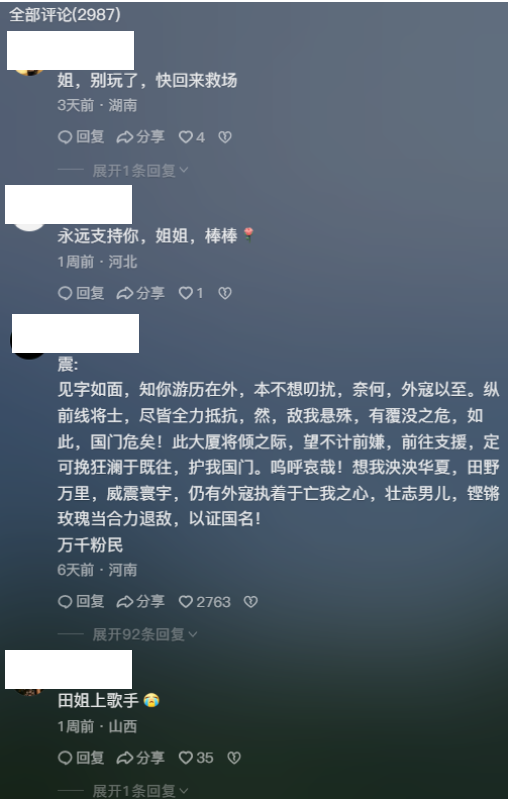 但是最近,田震视频评论区内网友的画风突变!看看网友的评论吧,纷纷呼吁她赶快回国!