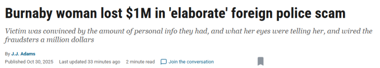 一宗精心设计的诈骗案,今年夏天让本拿比一名女子损失了1,000,000 加元。诈骗手法包括视频通话背景被设计成警察局,并动用了多名“演员”。