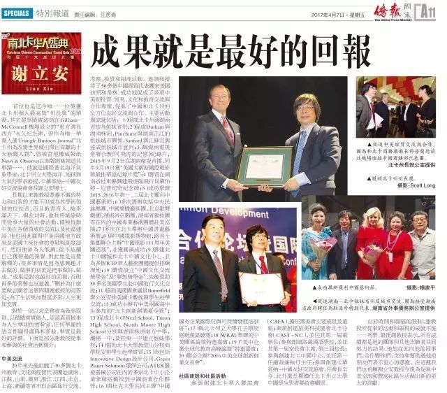 首位也是迄今唯一一位荣获北卡州个人最高奖“州长奖”的华裔,其主要事迹被铭刻在Gilliam-McConnell机场设立的“东方遇见西方”永久纪念碑, 曾作为唯一华裔入选Triangle Business Journal“北卡州为改变世界做出杰出贡献的十大新闻人物”,曾被当地权威报纸News & Observer以头版头条报道其事迹……, 他就是国际著名海洋气象学家,北卡州立大学海洋、地球与大气科学系教授,卡罗莱纳-中国友好交流协会会长谢立安博士。